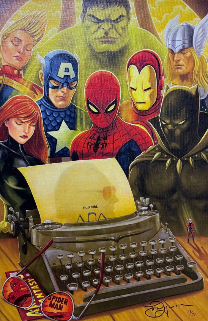 This Mighty Mini commemorating the life of Stan Lee has been hand-signed and remarqued by its artist Tim Rogerson. It is one of the last available pieces in a sold out edition. It is numbered 76/119.